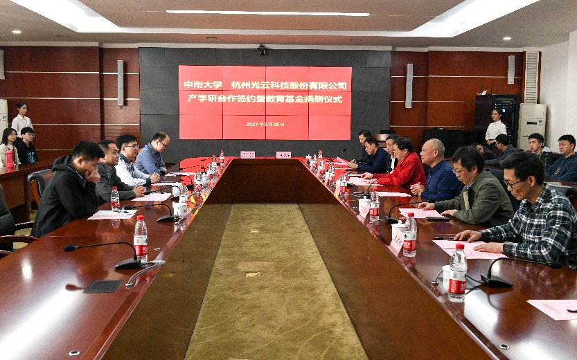 3月25日,伟德betvlctor1946与杭州光云科技股份有限公司产学研合作签约暨教育基金捐赠仪式在校本部举行。出席本次仪式的有伟德betvlctor1946常务副校长胡岳华,教育基金会秘书长张忠生,伟德bv1946官网首页党委书记陈志刚、院长王建新、副书记史建权、副院长曾锋,数学与统计学院党委书记段泽球,光云科技股份有限公司董事长谭光华、副总经理赵剑、资深经理陈才、董事长助理胡军,以及获光云奖学金、助学金的部分学生代表。本次签约仪式的主持人为伟德bv1946官网首页党委书记陈志刚。