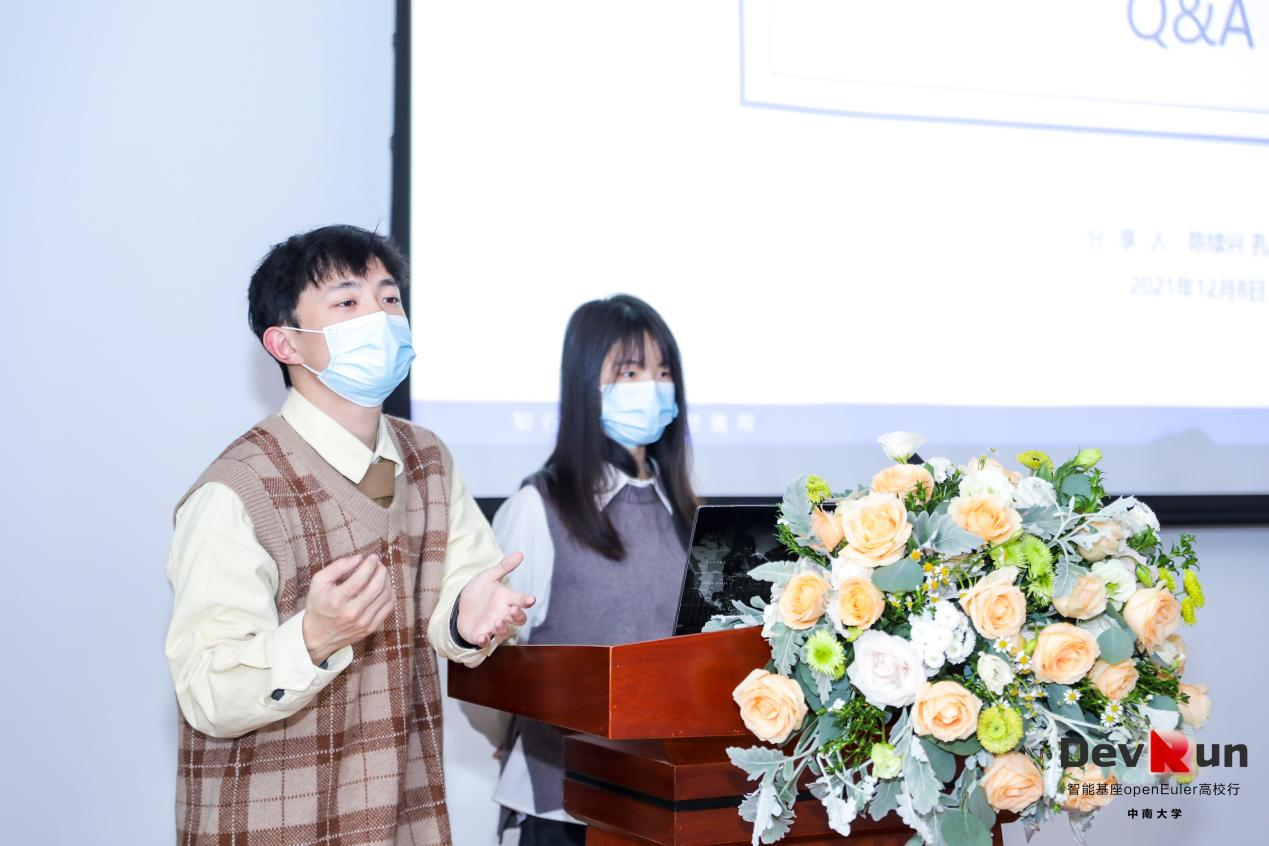 随后,我们参与开源summer活动的优秀学生代表陈续兴同学和孔克青同学做出了“openEuler 开源summer 2021参与体会”主题分享,讲述收获的故事。在当期的开源summer实践活动中他们完成了自己的项目,锻炼了项目的开发能力,更重要的是通过本次实践活动接触到了行业的前沿技术和精英,增长了专业知识的同时也开阔了技术眼界。