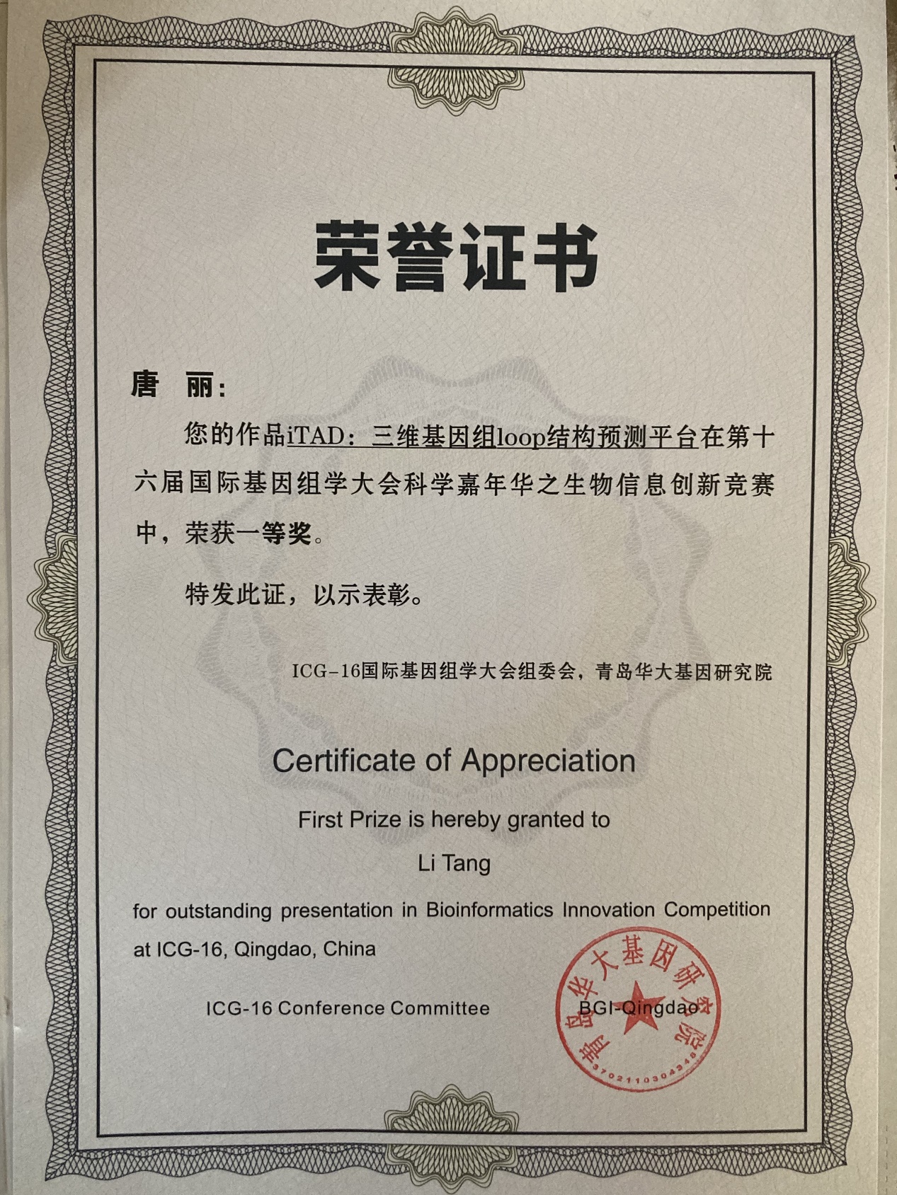 2021年10月31日,第十六届国际基因组学-生物信息工具创新大赛在青岛举行,受疫情影响,本次全国总决赛通过线上评比的形式进行。由我们李敏教授指导、2019级博士研究生唐丽带队的参赛小组圆满完成了内容陈述、作品展示、专家问答等竞赛环节,获得了一等奖的好成绩。参赛作品iTAD:三维基因组loop结构预测平台不仅能够对未知细胞类型、未知物种的loop结构进行预测,还提供了丰富的下游分析模块(motif分析、GO富集分析)及可视化功能。iTAD平台攻克了生物实验所面临的困难,为基因组三维结构的研究提供了更为快捷、成本更低的解决方案,具有较高的经济效益以及实际应用价值。