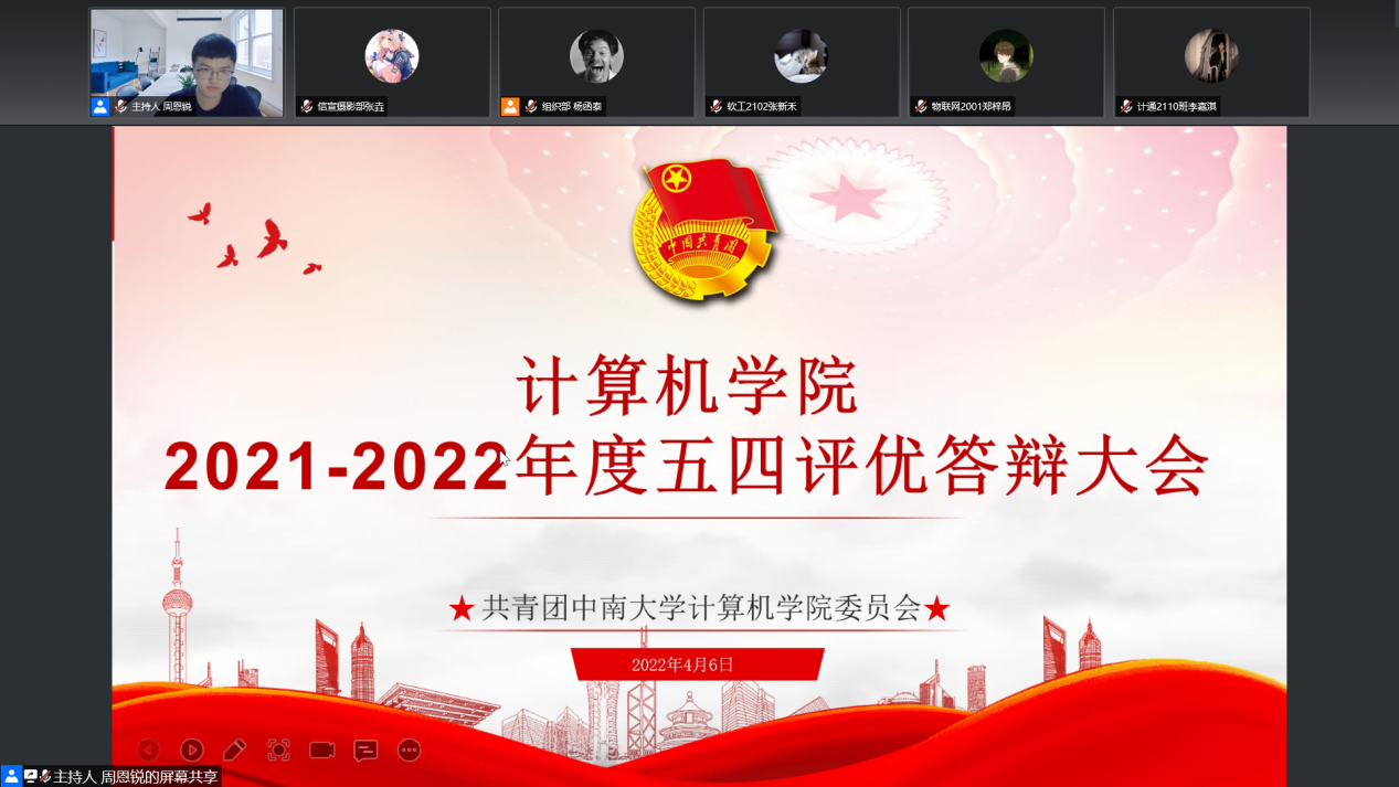 2022年4月6日下午两点三十分,伟德bv1946官网首页2021-2022年度五四评优答辩大会以线上会议的形式准时召开。出席此次大会的有伟德bv1946官网首页党委副书记史建权、学生办公室主任师雷宏、分团委书记许宁以及全体辅导员老师。本次会议由周思锐主持。