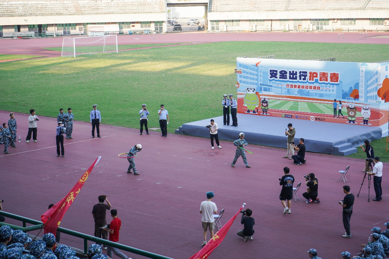 下午,伟德betvlctor19462025级本科新生军训开营仪式在潇湘校区“鸟巢体育场”举行,军训教官为参训新生进行了立正、稍息、跨立、行进等动作演示。同学们还在现场参与了“交通安全进校园”情景体验主题活动,通过交通安全主题脱口秀、洒水车视野盲区体验、交通标语你比划我猜等多样化的互动形式,积极参与学习交通安全知识,收获满满。