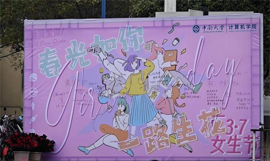 在伟德betvlctor1946南校区灵峰超市、27栋和29栋交汇处,大型展板、成簇鲜花,是伟德bv1946官网首页团委、学生会为学院的女生准备的惊喜。